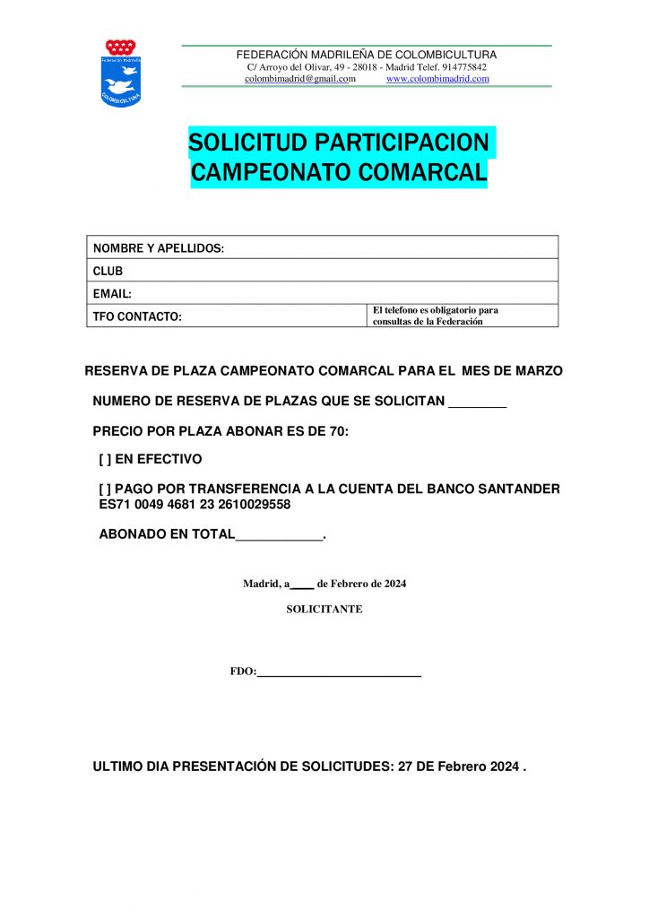 PARA PARTICIPAR EN EL CAMPEONATO COMARCAL HAY QUE ESTAR EN POSESION DE LA LICENCIA FEDERATIVA Y RESERVAR PLAZA ANTES DEL 27 DE FEBRERO CONFORME AL SIGUIENTE IMPRESO (Importante quien lo abone por banco y mande el impreso por email deberá adjuntar el resguardo de ingreso)